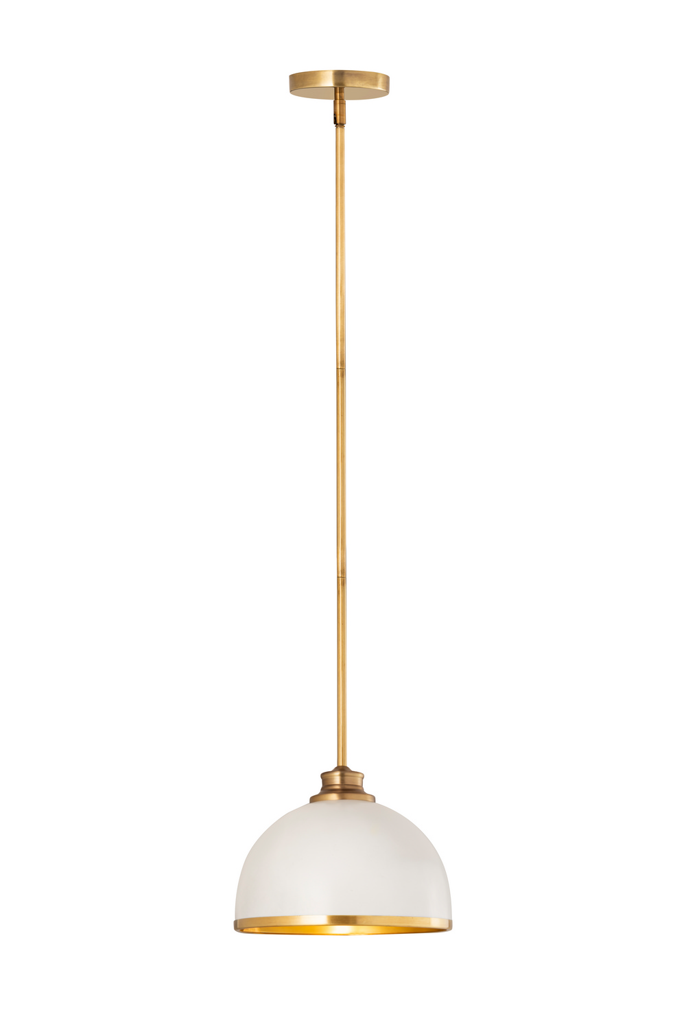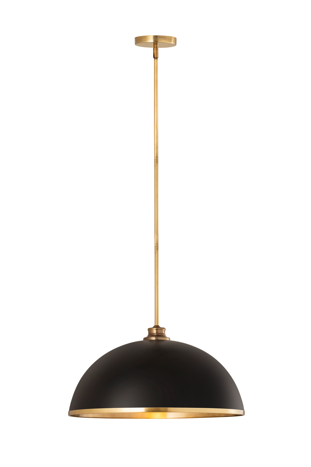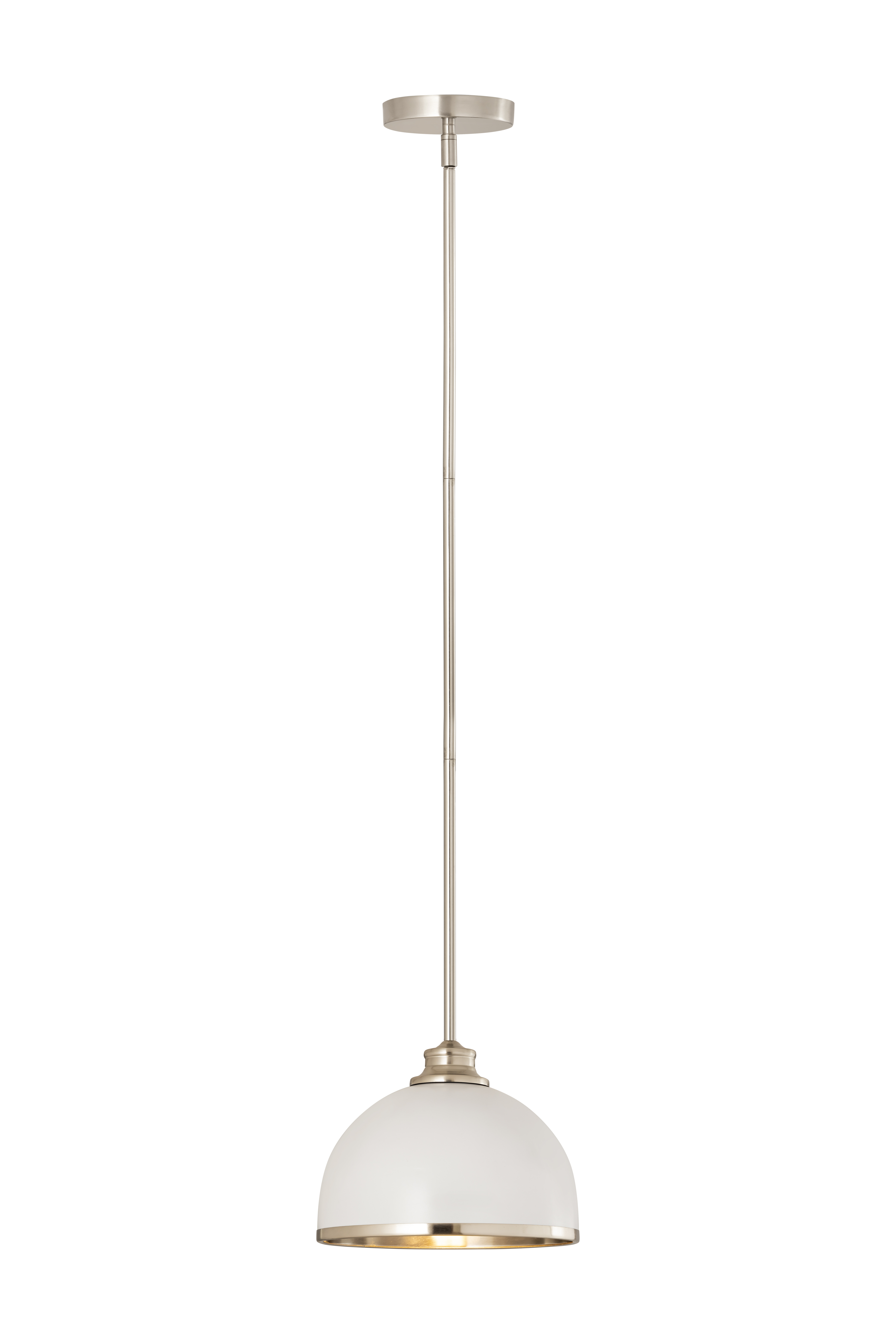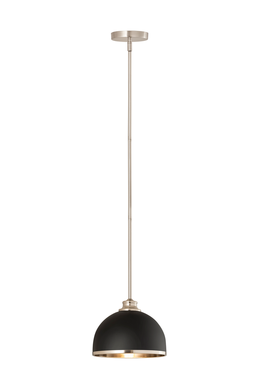 Easy elegance follows this domed metal one-light pendant with a crisp industrial influence and minimalist silhouette. A domed shade fashioned of matte black finish stainless steel is trimmed in brushed nickel finish metal with a brushed nickel finish down rod and canopy. This contemporary pendant is adaptable to a variety of decor schemes including farmhouse, modern industrial, and urban modern.