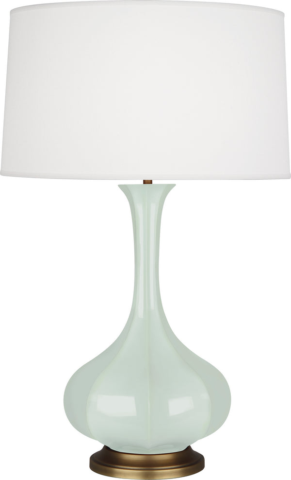 Our Pike table lamp will liven up your space with its unique design that incorporates an elongated neck sweeping down into an elegantly scalloped base. Available in an extensive range of colors, you're sure to find one that completes your space flawlessly!  - Baby Blue Glazed Ceramic Pike Table Lamp With Pearl Dupoini Fabric Shade