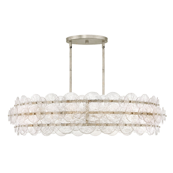 Rene radiates light through multiple layers of beautiful, pressed glass disks. Rene's signature touch highlights a Distressed Brass or Glacial finish, evoking both transitional and glam influences.